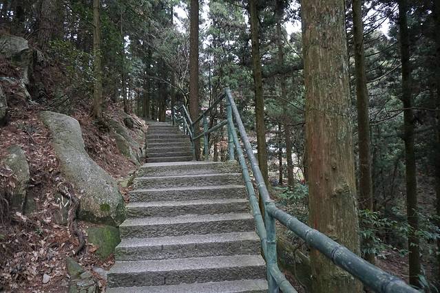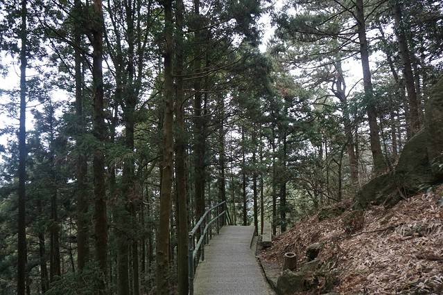 八点半刚出门就开始下雨,随便找了家早餐店一人吃了碗粉就坐观光车去黄龙寺,继续昨天没有完成的行程。观光车停在芦林大桥停车场站,一下车会看见一个饭店和超市,那有一条小路是去往三宝树的。淡季再加上下雨,一路只有我和云子俩个人,有种包山的感觉,台阶两侧是用竹子做成的栅栏,山上的树都是笔直笔直冲天长的,我俩查百度百科也没有确定到底是什么树。前一天听导游讲庐山的竹子粗细是杯口大的,而南边赣州的竹子粗细就是盘子口大的了。顺路走一段就有指示牌指示三宝树和黄龙寺的牌子,顺路先到了三宝树,所谓三宝树就是三棵有1600年历史的三棵树,两棵柳杉,一棵银杏。