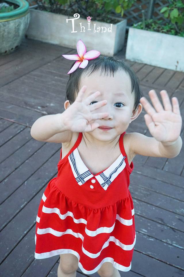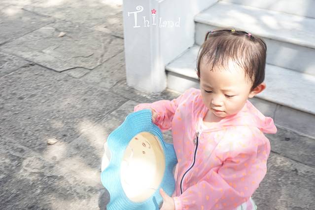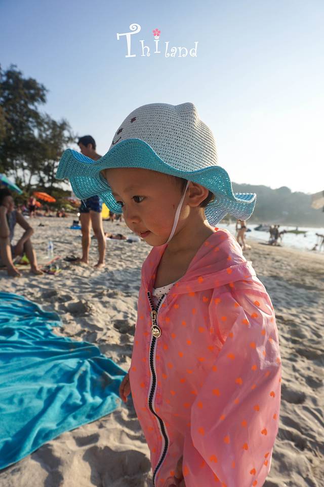 小盆友被热坏了,可是还得穿着防晒衣。