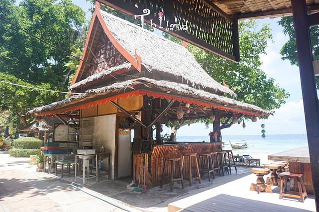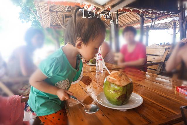 中午时,来杯冷饮也是蛮不错的。酒店餐厅就在海边,旁边几米就是呼啸而来的海水,但海水除了晚上大部分时候还是平静的,如一面碧绿的镜子。宽大的餐桌给了我们闲暇时休息之地。这里盛产椰子,点一杯fresh coconut才50B,比其他冷饮便宜的多还更加新鲜,每天限量供应。椰子不仅鲜美凉爽,椰肉也是相当爽滑,露珠我最喜欢吃椰肉了,看到别人扔掉简直是浪费。当我去前台点完,这边服务生就爬到树上去摘。哈哈哈哈哈,好和谐的画面。