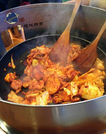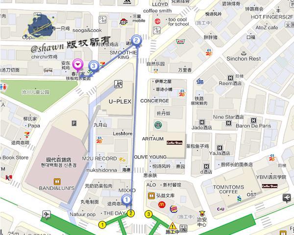 新村站2号出口上来是一幢蓝色玻璃的楼U-PLEX,走过U-PLEX后看到的第一个十字路口—春川炒鸡排(建议步行,若有公交卡,可公交卡换成乘坐270,271,273,721等蓝色公交车两站,即可到达新村五岔口现代百货商店站,过马路后通过现代百货商店和Natuu冰激凌店之间的那个巷子一直走,走到十字路口,过马路就可以找到春川炒鸡排了)