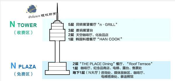 缆车:3层买票,然后在4层乘坐往返8000韩元10:00~23:00 (运行间隔为10分钟) 缆车晚上不运行,可以在明洞地铁站4号出口附近乘坐5路公交车,终点站是南山塔,返程车最晚10:30