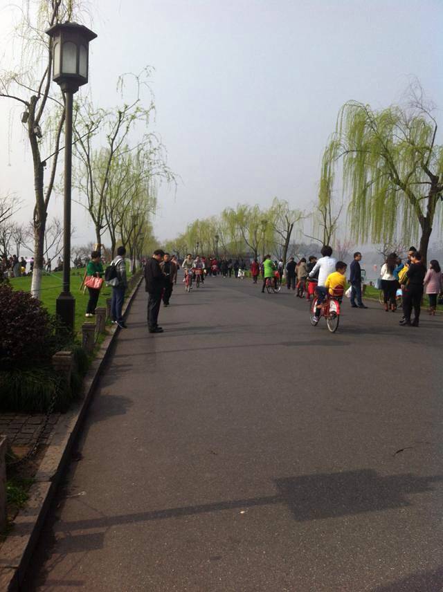 从徽杭古道下来往杭州出发,到达杭州已经傍晚了,因为之前没有在网上提前预定宾馆,所以,当时就先找宾馆了,可是因为是高峰期,西湖旁边的宾馆都住满了,我足足跑了几条大街,硬是把街认熟了才花高价住了一个一般的酒店,晚上坐在西湖岸上吹凉风,一天的劳累终于可以歇会儿,这个时候是多么享受和惬意呀。第二天上午租了自行车在西湖晃悠了半天,因为周末景区哪儿都人多,所以临时决定将一天的行程改为半天,下午坐车去周庄了。西湖美景三月天,其实,到了三月份,西湖并不是最美的,估计四月份以后,万物都复苏了才会更好吧。