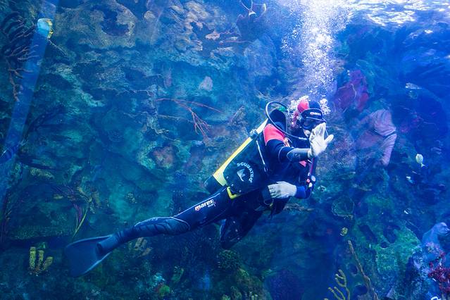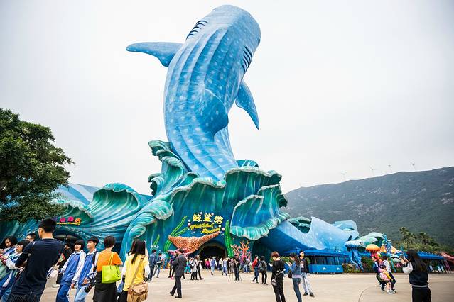 入园的第一站,我们去了最受游客欢迎之一的景点:鲸鲨馆。因为里面不但有各种美丽的海洋动物,还有世界最大的“鲸鲨展馆”和亚克力玻璃。这个装着“鲸鲨” 的亚克力玻璃宽达39.6米,高8.3米,厚650毫米,重达250吨,水体2.2万立方。因为其体积大所以视野壮阔,给游客带来震撼的海底奇观。这里主 要展出鲸鲨及其她魚類、珊瑚礁、海龙、海月水母、章鱼、花园鳗、多彩珊瑚、鳗鱼、鳐鱼、萨莉娜莱蟹、海葵、黄头虾虎鱼、寄居蟹、虾姑等海洋动物,不但可以 观看到它们的美丽还可以近距离观看到它们并且拍照,所以这个景点里面一直都是人头涌涌的。