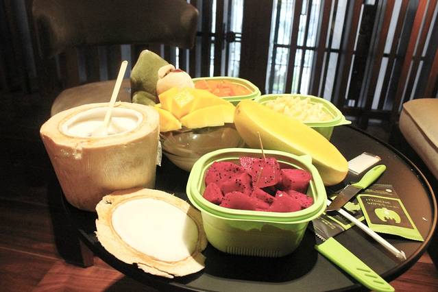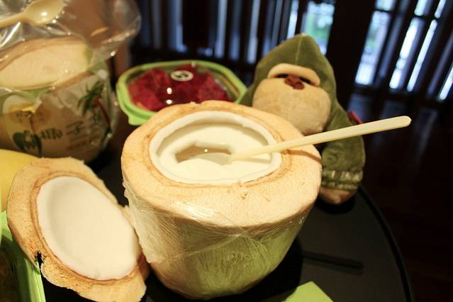 我们定的是一个套餐,因为今天我们是有车的人(一直默默的张同学的公司竟然在三亚有办事处,考虑到昨天4个小时的车程把我们折腾的够呛,于是今天从办事处挪借了一天的商务车),于是整箱搬到了车上,带上小刀,打算在休息时间来两个,在热带雨林吃热带水果,感觉棒棒哒。