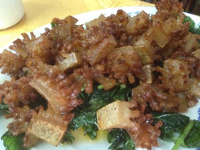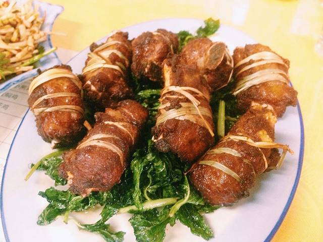 猪皮吃起来很Q~好几道菜都用了薄荷叶垫底,很喜欢炸过的脆脆的口感.我家乡用晒干的薄荷做花卷也超好吃~
