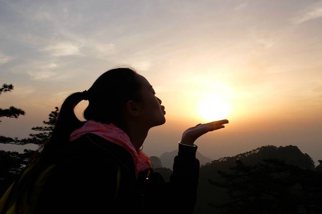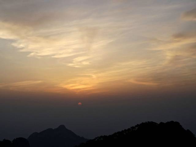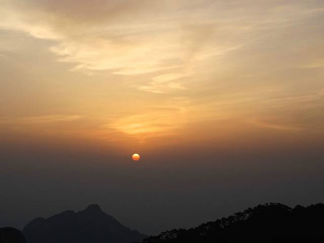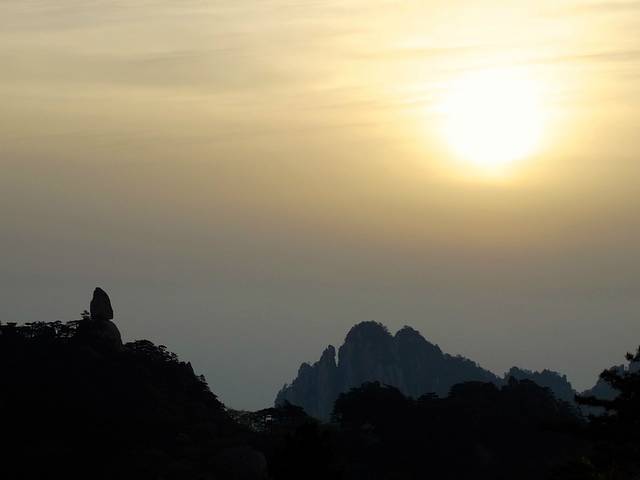 落日下的飞来石,其实黄山上一年中大部分时间是有大雾,有雾时才是看飞来石时好时候,今天阳光太好,看到的就是一块石头立在另一块石头上