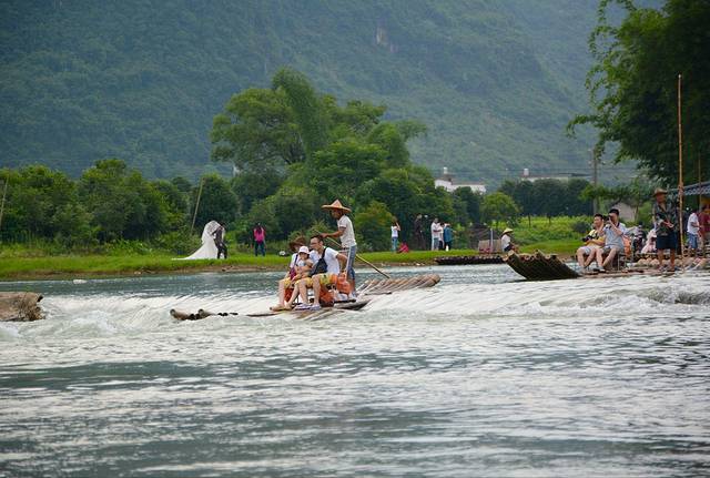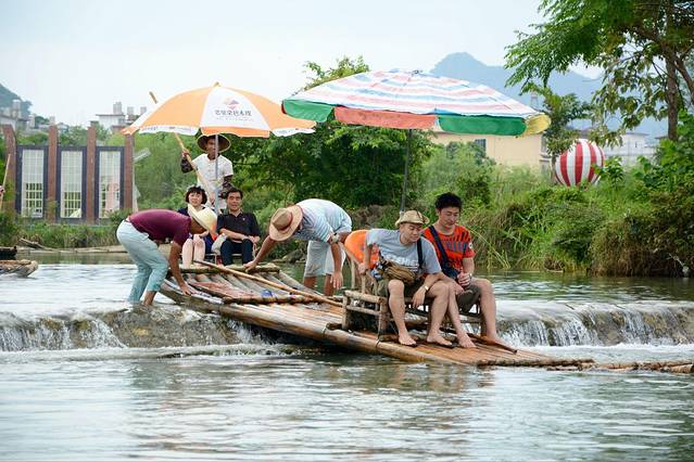 不知道什么原因,这只竹排冲下小坝的时候卡住了,场面很滑稽,竹排师傅两人一起把竹排推下去。
