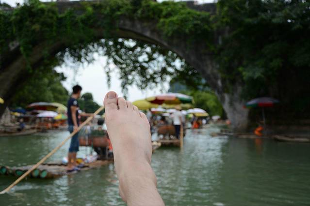 朱先生一上竹排就吼着要跳下去游泳,这么多竹排多危险啊,我不批,他就开启了露脚模式,好难理解他的世界