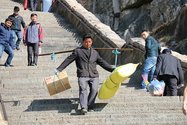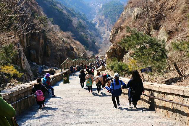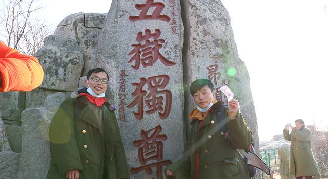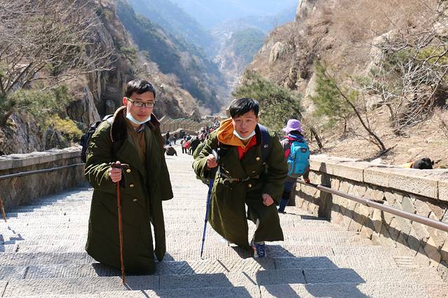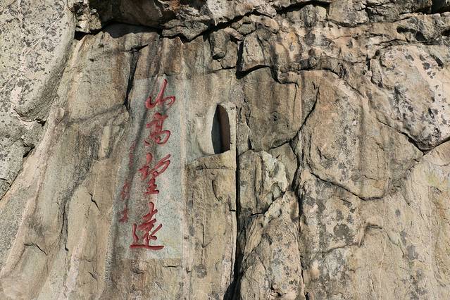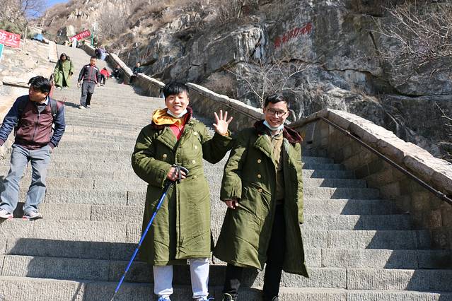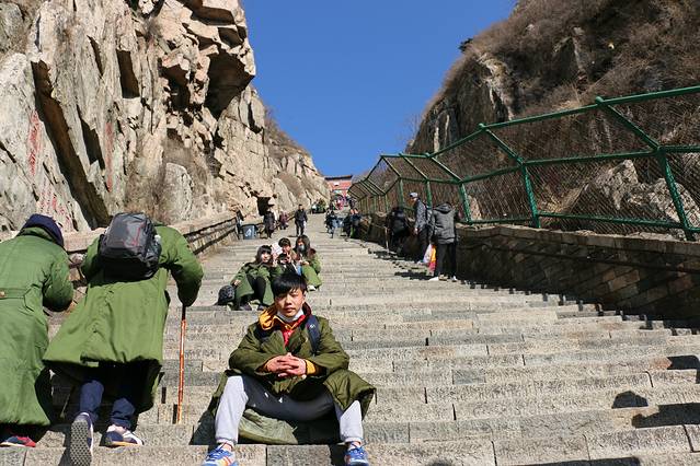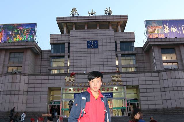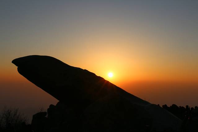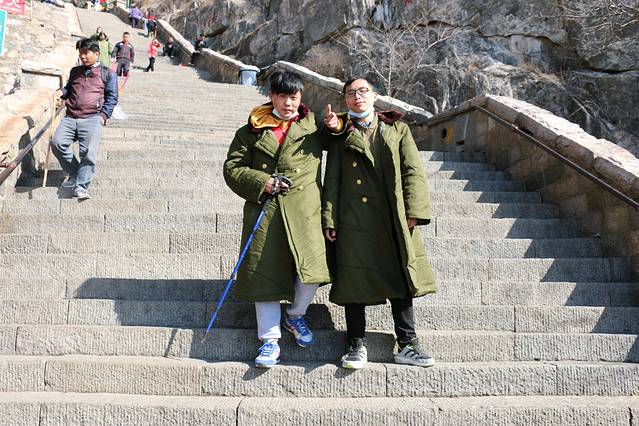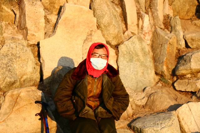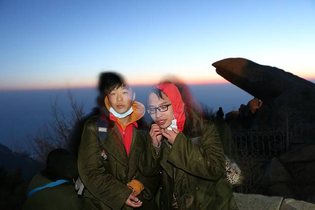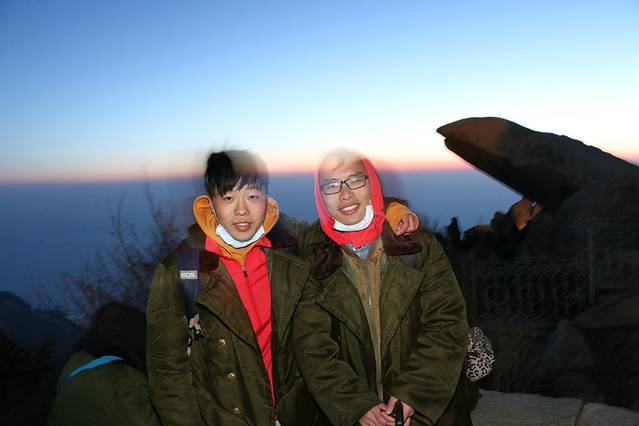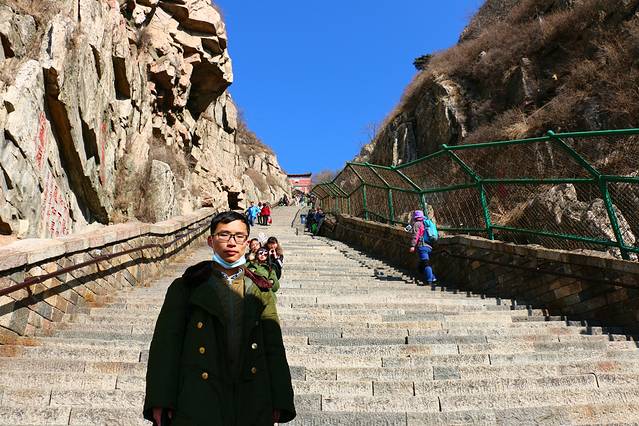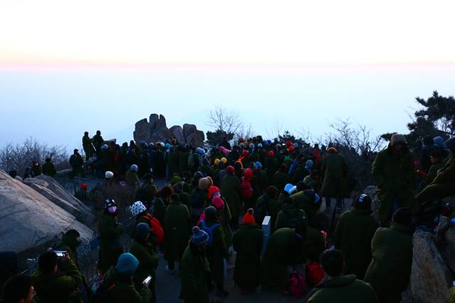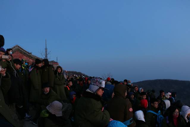 从济南晚上十点多的火车十一点多就到了泰山站,因为在济南玩了一天,下了火车后腿又冷又酸,没有穿秋裤而且外面穿的也是那种针织的运动裤,风钻进来是透心爽啊,听售票口附近工作人员说后半夜泰山区温度可能会降到零度,山顶会降到零下十多度,这个时候找个店买个保暖秋裤已经不可能了,租大衣也护不住膝盖下面,但自己做的选择又能怪谁呢? 唉,硬着头皮爬吧~~ 大半夜的,因为周末的原因吧,觉得人特别多,一个个拄着拐杖就像丐帮弟子去山顶开会去似的~~ 月光很皎洁,上山时买的头灯基本没有用,因为打开手电筒后反而觉得不舒服,还不如月色下爬山那种感觉。爬了一段时间后,膝盖有些痛,可能是冷的原因吧,或者是运动过量,亦有可能是上个礼拜打球膝盖受过伤。不能再受寒了,机智的我路边卖东西的小店里买了条毛巾包在了膝盖处,然后用祈福用的红绳上下绑了下,继续出发!!! 很喜欢爬山的过程,踏实低头踩台阶才能到达顶峰,就像做人一样!不到三点就已经爬到快到南天门的地方,这时景区的喇叭喊着建议游客不要继续爬,半个小时就会到达山顶,然而六点半才会出现日出,于是我们就吃点东西准备好好休整下,可是坐下不到十分钟就冻的发抖,因为衣服里面基本上湿透了,就在附近和同伴租了两件大衣裹在外面全身缩成一个球休息了差不多两小时,期间用扇贝单词还打了一天的卡,唉,我也是服了自己了,在学校也从来没这样用功过,姑且就叫做做作吧~~~五点有又开始出发,一路上累但很快乐,因为有信念支撑着!到达观日峰后已经人山人海,找了一个有利地点撑起三脚架就等日出那一刻···········