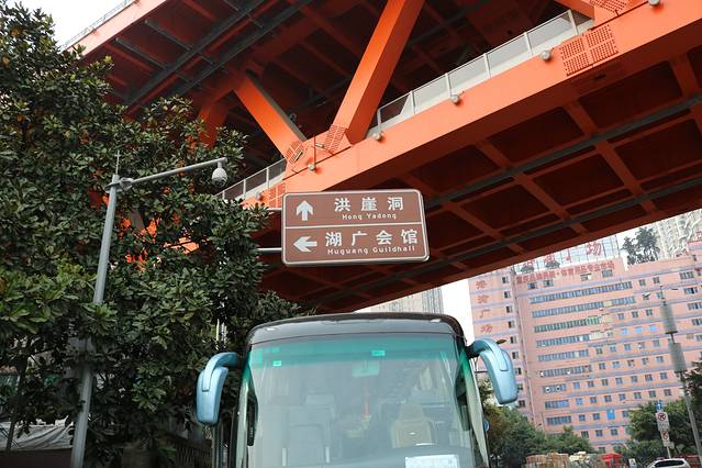 出来抬头看路牌可以看见洪崖洞的指示牌,得穿过一个长长的大隧道,步行即可,不好打车。