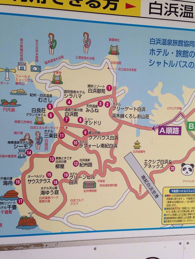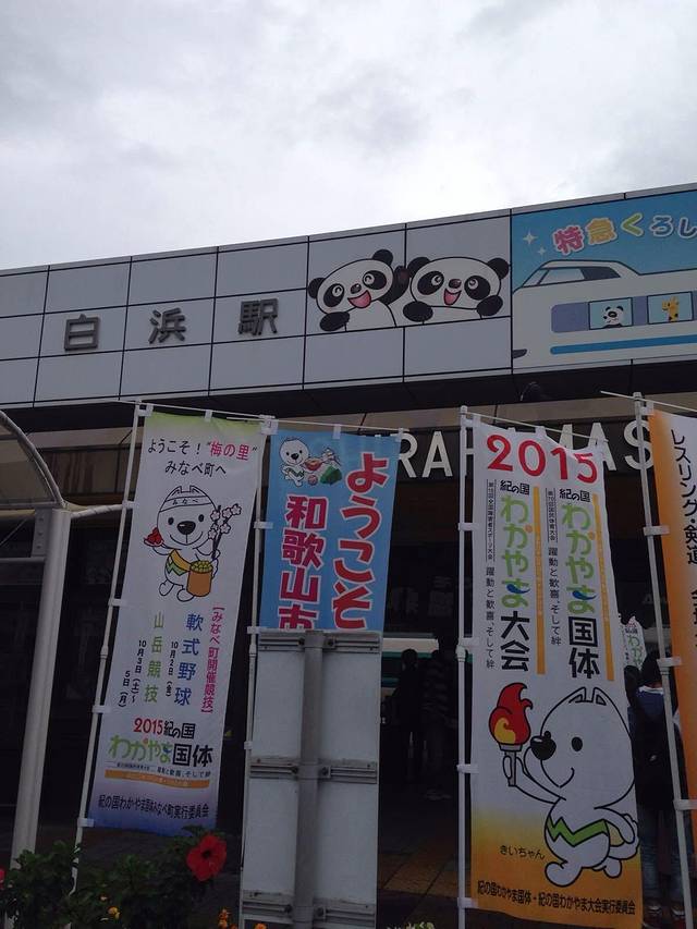 白滨地区最著名的是白滨温泉了,是被列入日本三大古泉(另两个是有马温泉和道后温泉)的传统温泉。白滨的地名,来自周围大面积的白色沙滩,细腻而柔软。除了这些当然还有著名的三断壁和日月岩。以及小朋友们喜欢的白滨野生动物园,它是中国之外鼎鼎有名的熊猫乐园,这里也因为熊猫的存在,而显得非常特别,连JR列车中都有熊猫座位可供游客拍照留念。由于时间关系都没有一一游览,甚有遗憾。