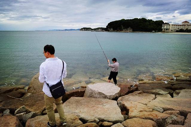 小插曲:爬上岩石摊后,发现了一位大叔正在钓鱼,陪他一起的大妈平躺在岩石上睡觉。小凤哥兴奋不已,凑上前去观望,没想到大叔对着他用日语说:你来试试!小凤哥用中文提问:鱼饵呢?大叔居然听懂了,回答:用岩石旁的蛤蜊或者小虾坐鱼饵……小凤哥也听懂了,这两人鸡同鸭讲,居然都能理解,我在旁看到傻眼。