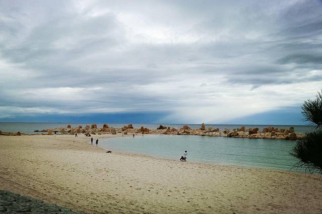 到了海滨城市,则一定要去沙滩走一走的。继续坐公交,白滨也不大,几站后到达了白良滨,一路上也没见几个人,整个城市给人以宁静祥和的感受。