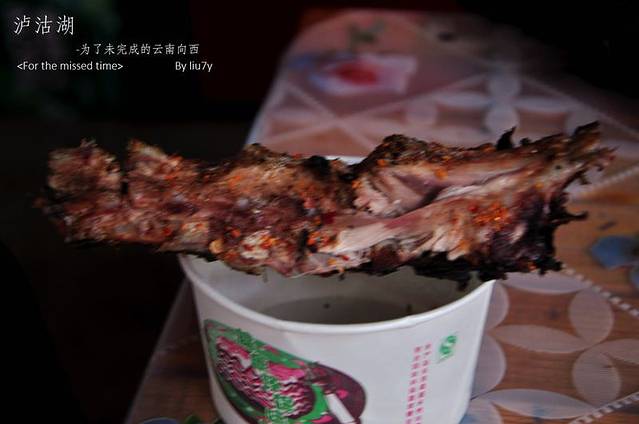 然后赵哥又烤了一点这儿的特色坨坨肉给我们吃。