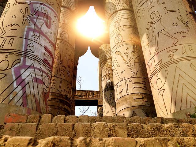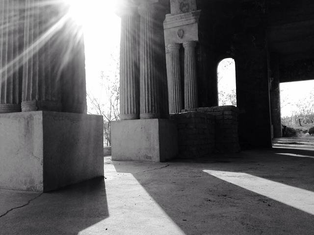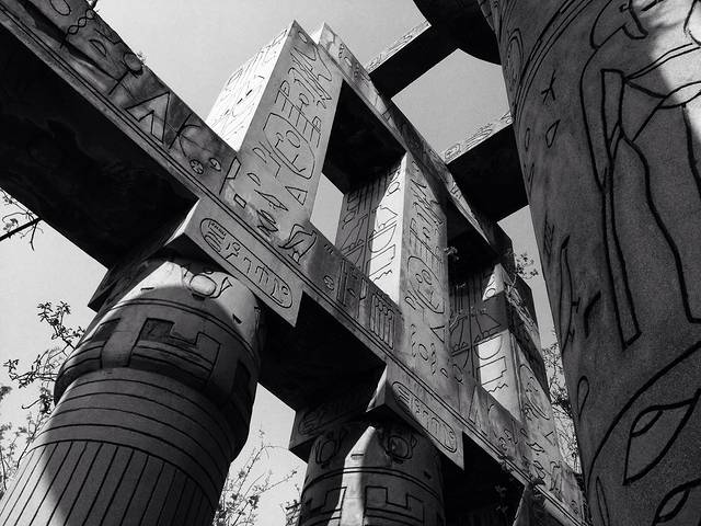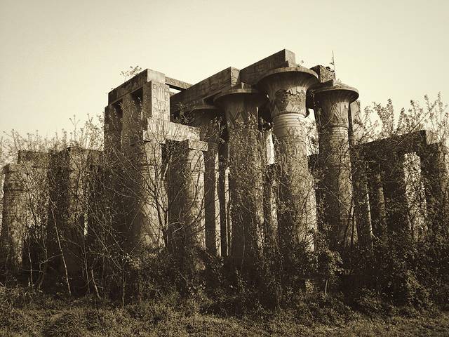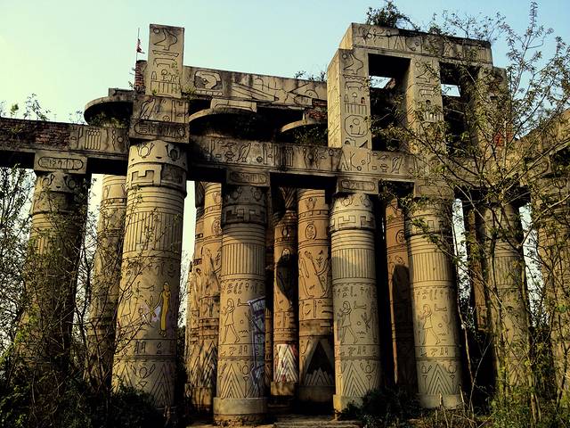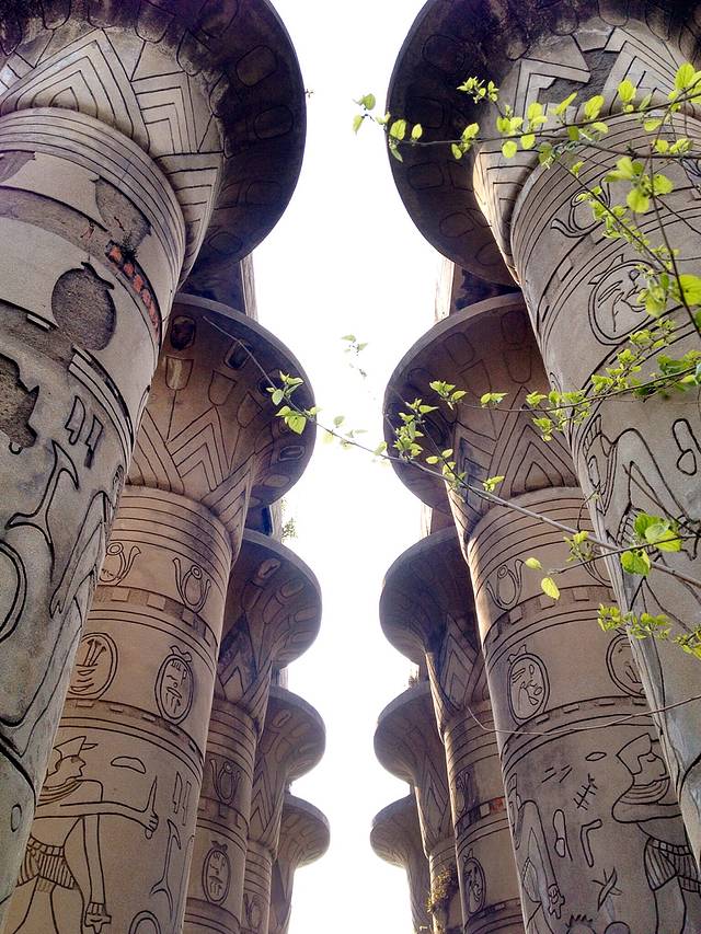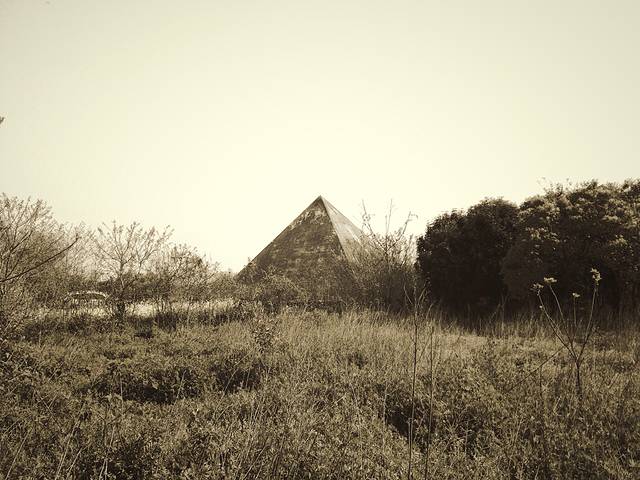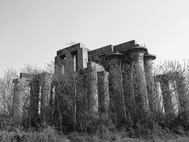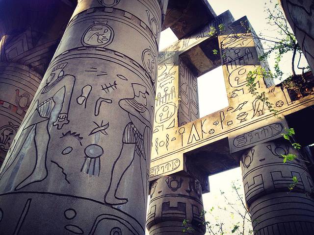 我们在公交站下车后,一开始不知道路绕着走大路绕了很远,沿途还是有很多村民的民房的,所以一路边走边问,最后终于在靠湖的位置发现了金字塔的影子,可能是这里被村民开垦复耕的原因吧,所以这里也并不显得那么荒凉,靠近金字塔后发现,其实金字塔并不很高,而且表面经风雨侵蚀后显得斑驳,与埃及金字塔的差异还是很大的,毕竟它很小并不精致,继续走到湖边,很多人周末开车在此户外烧烤,有些热闹,在湖边有一个建筑,仿制的“玛雅神庙”Maaya,说实话,这个建筑是这次游玩途中最喜欢的一个建筑了,因为它很高大,石柱构造很有复古风格,而且每根柱子和横梁上都刻着各种图案的画和文字,像极了玛雅神庙,虽然周围杂树丛生,但我依然走进去拍了不少照片,看完了神庙我们决定沿湖往回走,走了一段路后我们便发现了另外两个建筑,一个外观如同一个金字塔上搁置了一个大箱子,另一个如同荷兰风车房子,只是上面没有了风车,特别破旧,其实我也并不清楚这到底是什么建筑,继续前行,发现了另一个类似神庙的建筑长廊,建筑正上方写着“IOSEPHOIF AVCVSTO⋯”的字样,这里像是经历了一场大火,建筑内壁显得漆黑,走后发现的建筑是一座哥特式古堡,走近一看略微有点失望,古堡只是模型,人并不能走进去,虽是模型,但是做工依然精致,很古朴很漂亮。