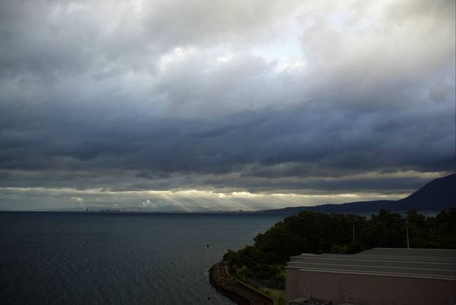 因为台风的关系,别府湾的早晨被乌云笼罩着