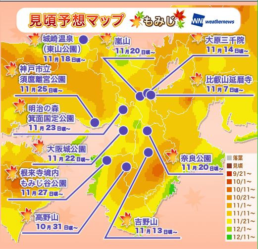 2015 年关西红叶最佳观赏时间预报图