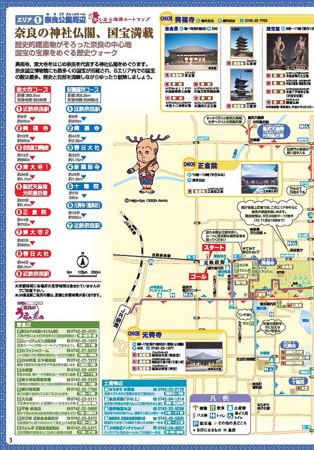 具体顺序为近铁奈良站(或 JR 奈良站) - 兴福寺 - 奈良国立博物馆(参观时间最少要 2 小时) - 东大寺 - 圣武天皇陵 - 正仓院 - 再次路过东大寺 - 春日大社 - 车站。全程约 9 公里。这个线路最不好掌握的就是吃饭的时间。