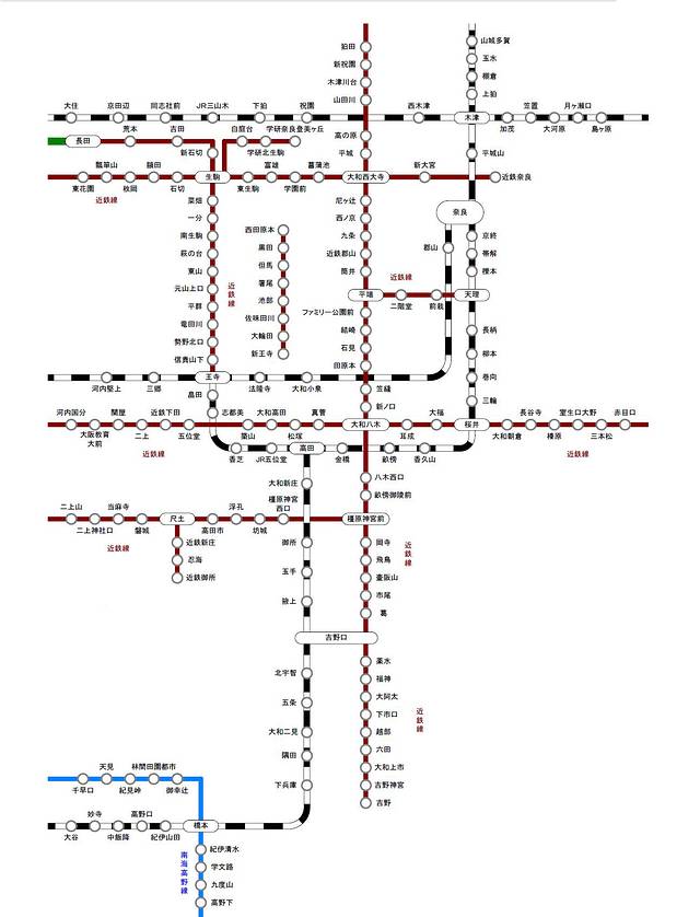 下图是奈良县的铁路线路图。注意不是奈良市的。红线是私铁;黑白的是JR。如果有需要,请先试试另存为图片,如果字很小,实在看不清楚的话,请不要客气,回复或私信,我会发给你~