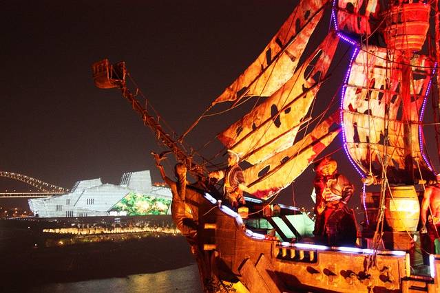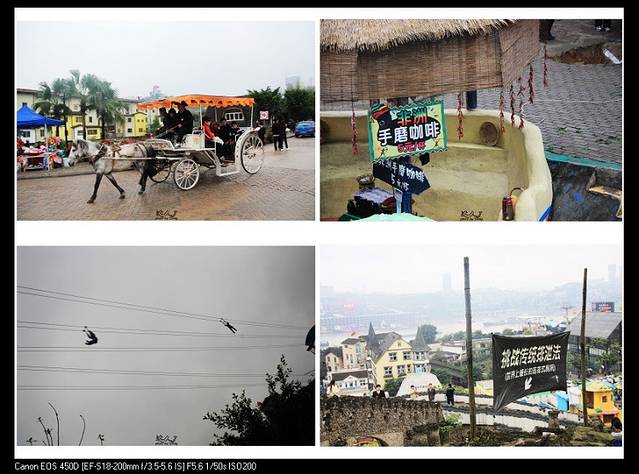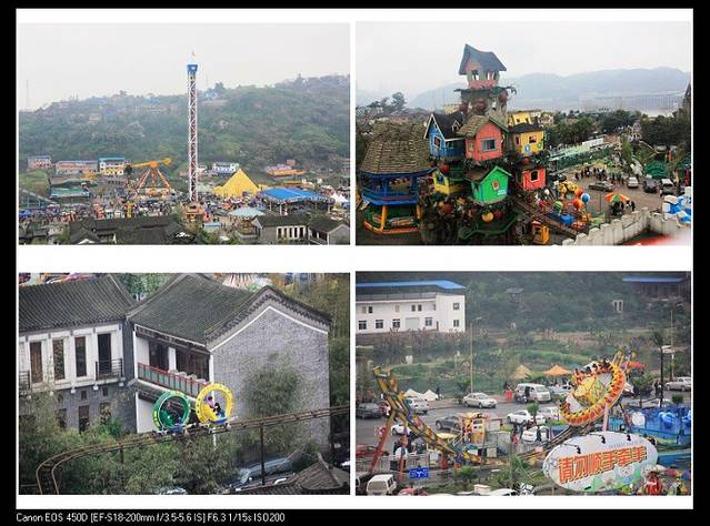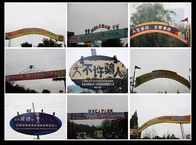 重庆的洋人街在南岸区,和朝天门隔江相望。坐出租车一路沿着看夜景最著名的南滨路飞驰,路标一块一块地甩在后头,突然醒觉重庆还有这么平这么阔的一条康庄大道!随着簇拥的人群步入洋人街,嘈杂的机动游乐项目发出的声音开始充斥四周,更抢眼球的是这里高高挂着的一道道标语和指示牌,什么“我视金钱如粪土,我爸视我为化粪池”,什么“要成功,先发疯,头脑简单向前冲”,“人生如戏,全靠演技”,还有“咸鱼翻身还是咸鱼”……接二连三地把人雷得一愣一愣,雷得外焦里嫩!臭名昭著的“世界最牛厕所”长达600米,听说可以同时容纳600人如厕!我倒!还有各种把人甩来甩去的机动游戏,把人吊在半空从一边滑到另一边的人肉观光滑索。咆哮啊!发泄啊!心情郁闷的时候来洋人街应该很有收获。我没有玩什么项目,而是跑去在乱吼一条街上买了2根羊肉串,蟹肉、牛丸、热狗肠和羊脖子各一串,总共加起来才7元,我对洋人街跟外边比没有涨价的亲民行为表示欣赏与赞同。