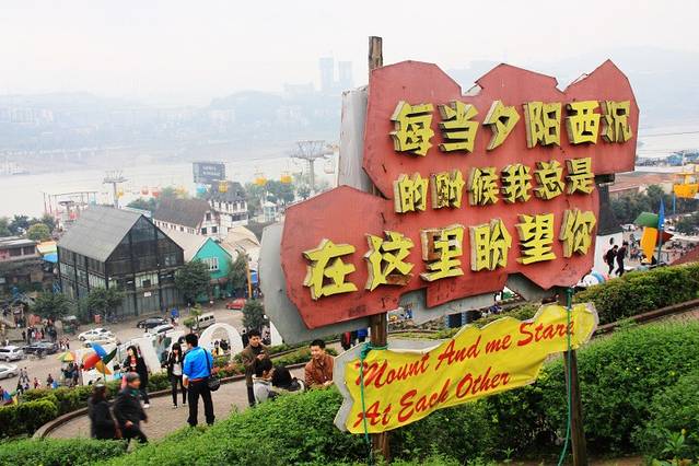 告别了一堆雷人语录和那个雷人厕所以后,漫步在南滨路的沿江大堤,视野豁然开阔,一马平川的世界里似乎找不出半点山城惯有的崎岖起伏和高低不平,10分钟前在洋人街遭遇的恶搞趣味,突然转变为一副浩浩荡荡的江山油彩画,有一种说不出口的幸福感油然而生。江对岸的渝中区市中心的高楼已开始星星点点,华灯初上。我和同伴小王约好在南山上的泉水鸡一条街碰头,吃完泉水鸡顺道在附近著名的“一棵树”观景台,俯瞰价值百万的“小香港”夜景。