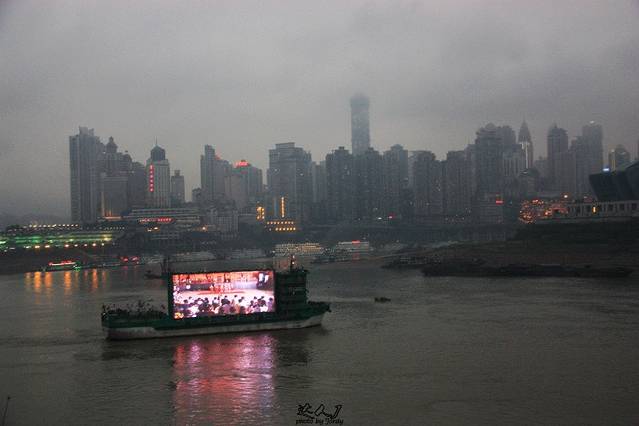 硕大的荧屏展示着重庆的新貌,和背景现代高楼林立的渝中区相映成趣