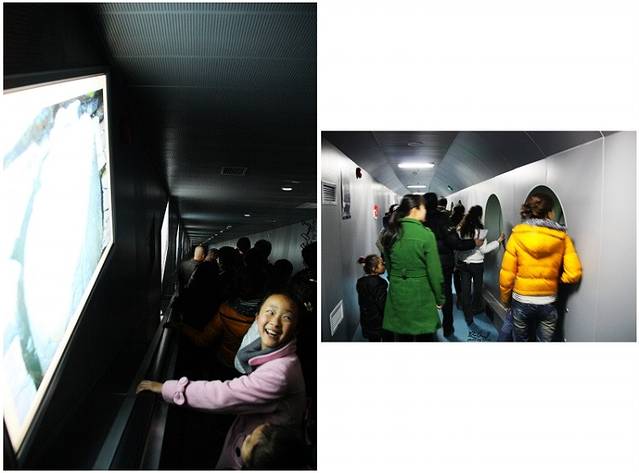 蓄水后,整个白鹤梁竟沉于长江江底!由此世界最大水下博物馆迎刃而生。游客需通过严格安检,乘坐长达90米的隧道式扶梯下到水下39米深处(左图)。透过环形廊道上的一个个圆形玻璃舷窗欣赏“水下碑林”(右图)