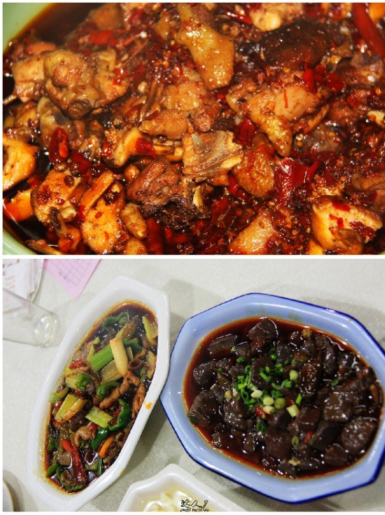 传说中的南山泉水鸡,一鸡三吃。红烧鸡块(上图)炒鸡杂和鸡血汤(下图)