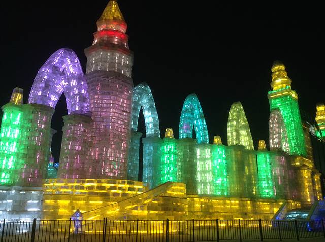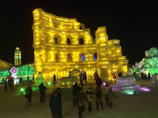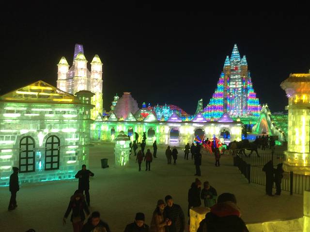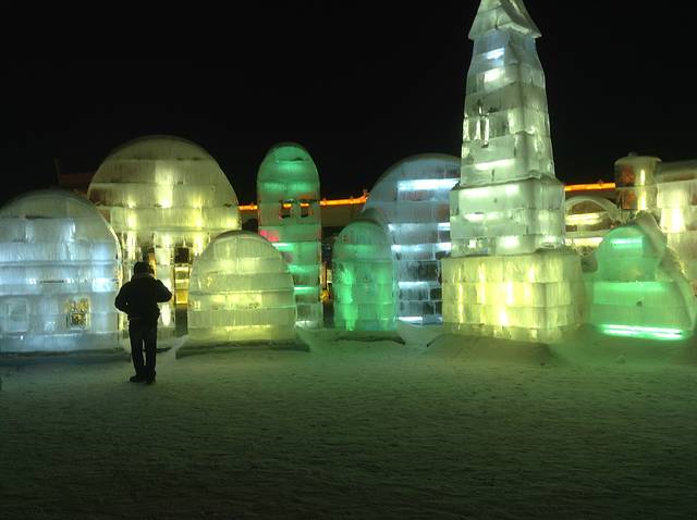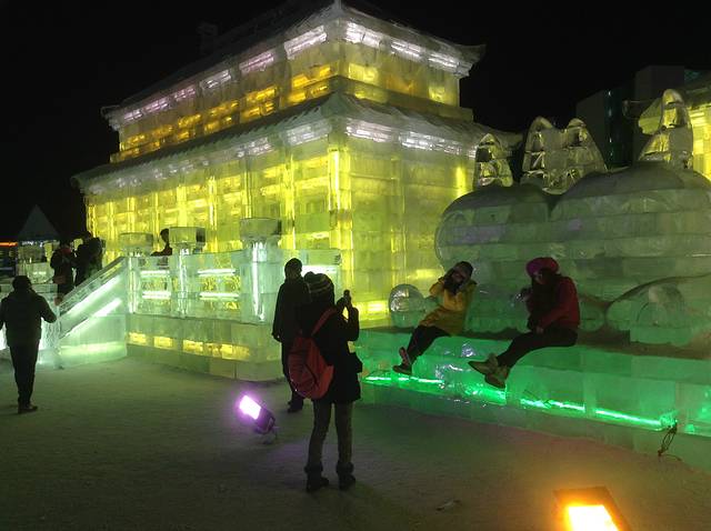 去看冰雪大世界,最好是下午两点钟,滑两个小时雪,天就黑了,可以看见这些白日里晶莹雪白的雕塑们在夜里如何妖娆起来。