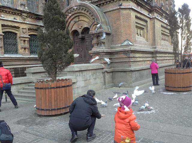 ,一群群鸽子咕咕叫着群起群落,栖在教堂的檐下,窗格子里,并不怕人,喂得熟了,把鸽粮放在手里,它也肯来吃。教堂边有卖鸽粮的,善意的提醒人们不要喂给鸽子人吃的大米,说是会影响它的消化系统。