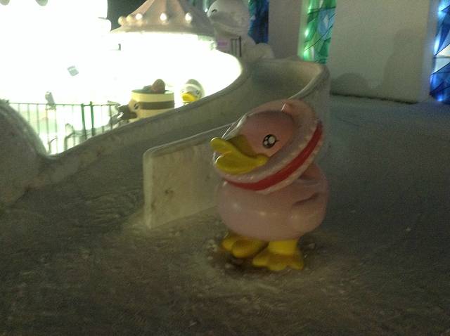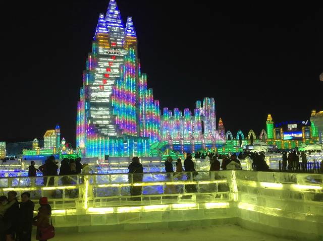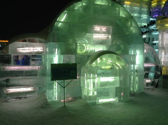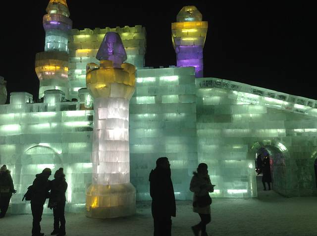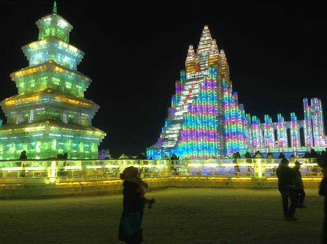 冰灯是哈尔滨这座城市冬日里的传统项目了,我儿时来过一次,从一个对我来说山那么高的大滑梯上滑下来,风驰电掣,一路嚎哭,所以印象及其深刻。那时的冰灯还仅限于拙朴的动物造型,里面插进去一个彩色灯泡儿,不像现在,城堡,亭台楼榭,卡通人物,教堂。。五彩斑斓,应有尽有,果然自成一世界。美中不足的,是好多极漂亮的冰雕上面亮着一行大大的红字----xx银行!真是倒尽胃口!