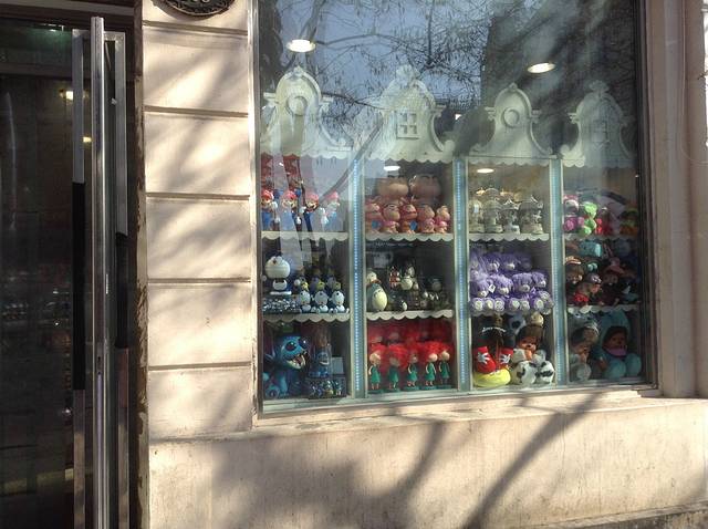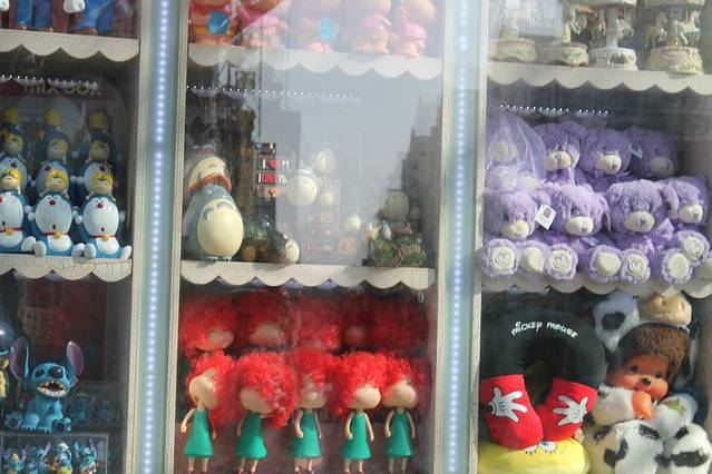 黑色的小面包石头路油光圆润,两边各色店铺,饭馆。店铺里陈列的多是俄罗斯特产,工艺小镜子,巧克力,打火机,女孩子的头巾,首饰盒,套娃娃,我们花四十块买了一个古铜色城堡造型的小镜子,很是喜欢。随着人流前行,见到有家秋林公司的特产店,买了著名的哈尔滨红肠。