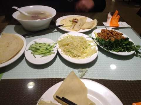 中午吃了道地的东北家常菜,老昌春饼。饼皮薄,软,筋道,名不虚传。鸭架汤很稠,京酱肉丝味道非常正宗,地地道道的东北味道。