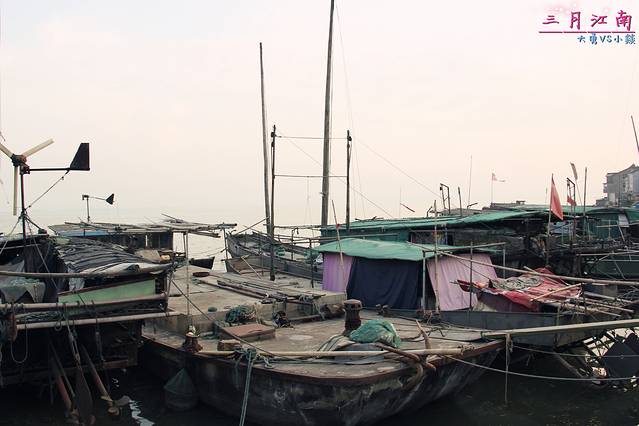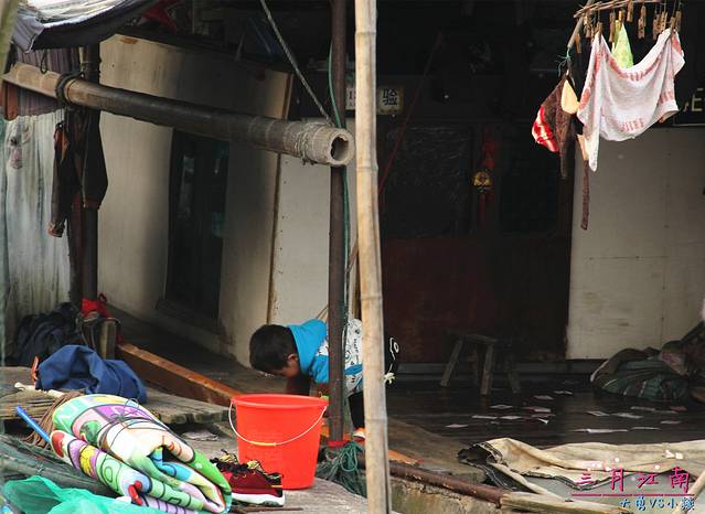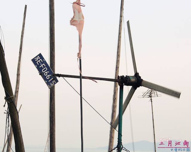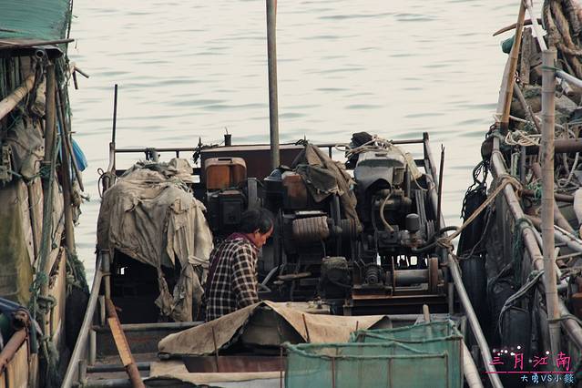 走到岸边映入眼帘的是一排排渔船,正值休渔期,岸边排了三四层的渔船。泊在湖边的渔船一览无余的展示渔民的生活情境。渔民常驻太湖,世代靠打鱼为生,船就是他们的房产,是飘在太湖的水上人家。从堤岸往船上望去,一布之隔,船舱里生活不得而知。偶尔听到船上有禽类的叫声,孩子嬉戏声,或看到一家人围在一起吃饭,亦或是随风而动晾晒的衣物。