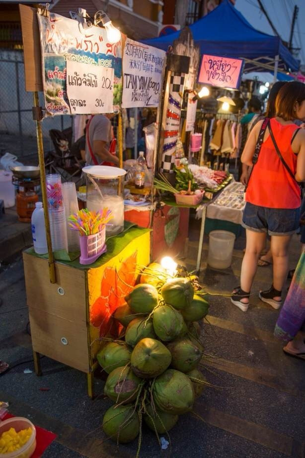 吃饭小店里30〜70b,主要看点什么,各种鲜榨纯果汁和冰沙都赞死了15〜25b。夜市小吃各种好,通常也就10b20b,围巾鞋子T恤基本都100b,马杀鸡80b半小时。夜市下午五点开始,大喇叭可能会放起歌声来,这是泰国国歌,要停下手头的事情,立正站好,歌声结束后又是一片喜气洋洋了。