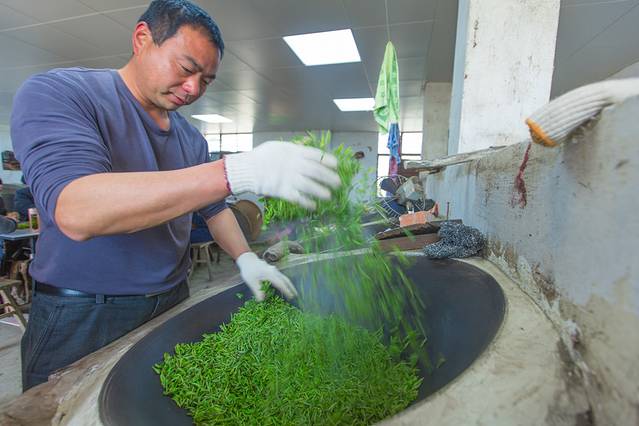 全手工炒成后的干茶条索紧结,白毫显露,色泽银绿,翠碧诱人,卷曲成螺,