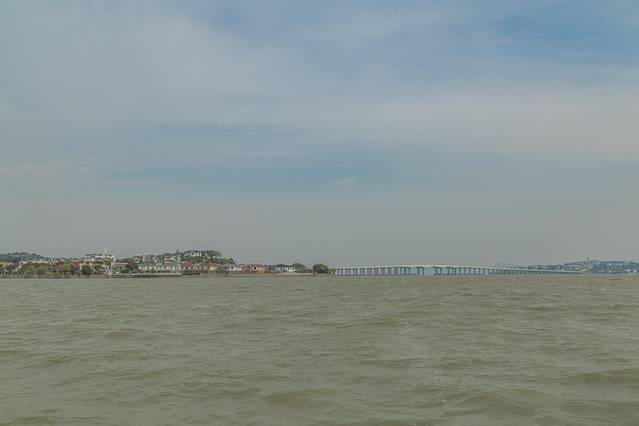 远眺太湖太桥,该桥于1994年通车,北起太湖国家旅游度假区渔洋山,南至西山大庭山,跨太湖,连接长沙岛、叶山岛、西山岛,由1、2、3号桥组成,成为太湖上一道非常耀眼的风景线。
