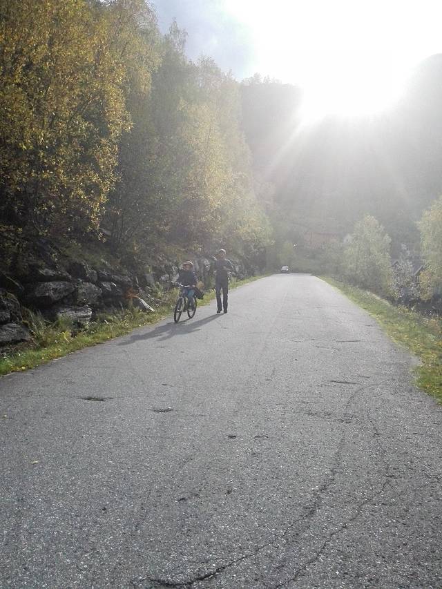 骑行2公里后,遇到麻烦,上了正式公路,但路正在修。通往艾于兰的公路是单行道通车,考虑孩子骑车太不安全,不准他在公路上骑车,转向山上骑。