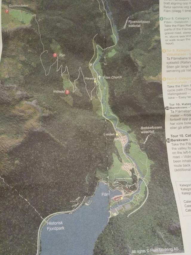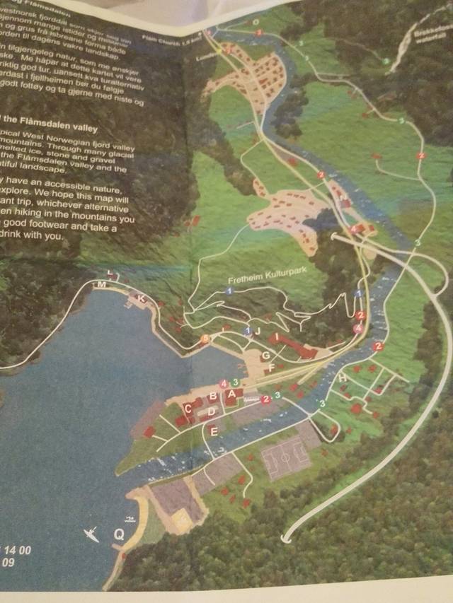 这家宾馆在位置C。徒步线路中,1最短,7最长,5线是平缓的骑行路线。2、3、4、5、6 其实都是一个方向,就是沿铁路往弗洛姆老城走,上山走20公里,就到了弗洛姆小火车的起点myrdal。