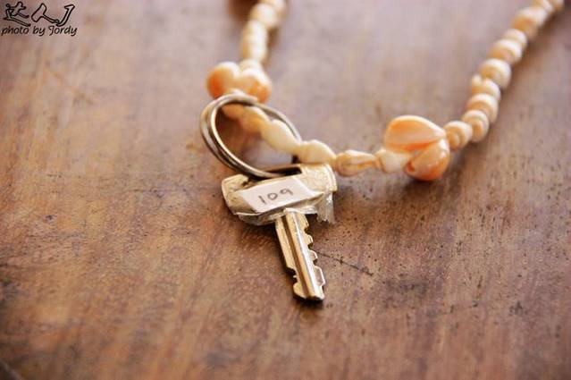 迎客时酒店送的贝克项链,上面栓着我们的房间钥匙