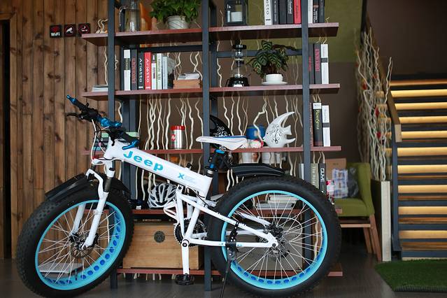 底楼大厅一角,山地车是给喜欢骑游海岛的游客租用的。
