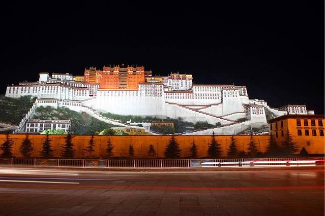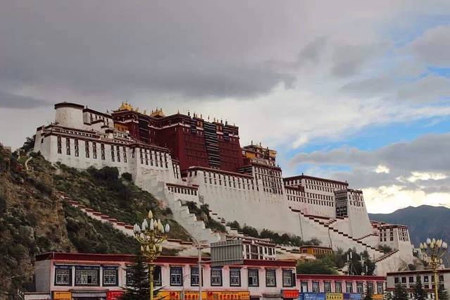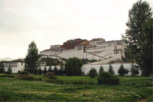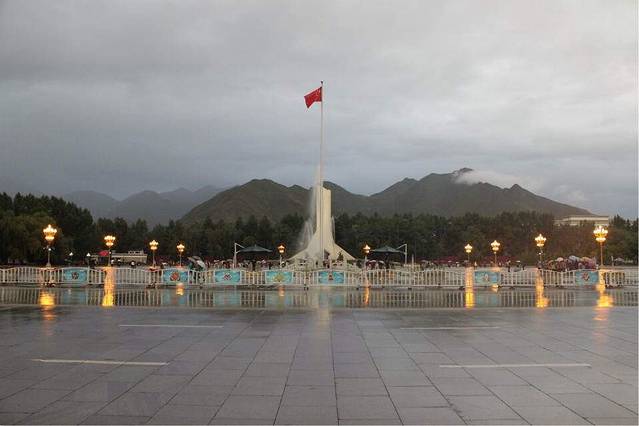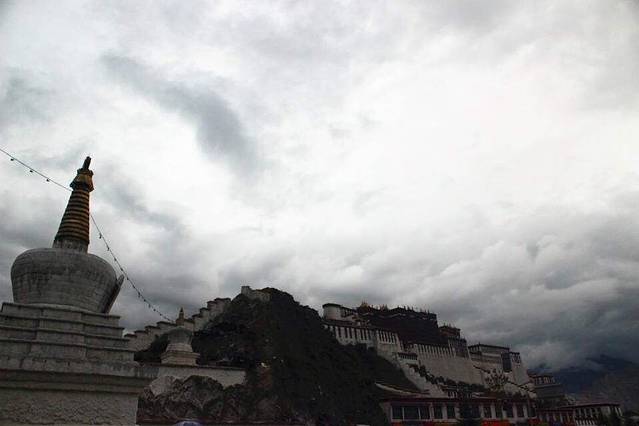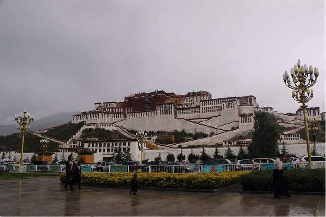 从大昭寺出来步行到布达拉宫,傍晚,又下雨了。这里是从布宫广场看布宫。