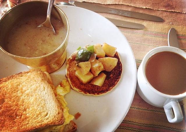 2小时以后,我们的吉普车停在路边的一家早点铺子吃早餐,薄饼,鸡蛋,咖喱汤。