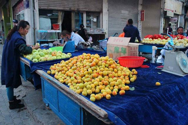 逛了一圈,吃了一碗羊杂汤,一只烧饼,三串羊肉串,吃不下啦!想起没吃到蔬菜,路过水果摊又买了蟠桃和杏儿,心满意足搭公交回酒店。