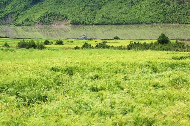 二位小卓玛带路,我和同住的小石一起认识了她们家的牧羊犬和小羊羔,我们还穿过藏獒看守的村庄,一路采野花,一路玩到黑马河边