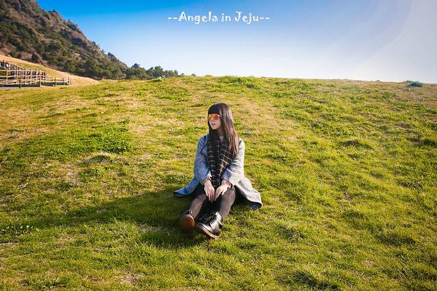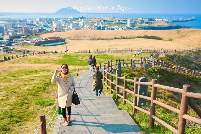 与柱状节理带不同,这里不仅只有海和天~这幅为之惊叹的画卷中,有一望无际的草地,有绵延起伏的山峦,有海天一线渐变的蓝,有眺望远方便可俯瞰西归浦城市的风景~登顶的路被修成了规整的阶梯,旁边木质围栏也是这幅画卷的点睛之笔~小草还未全部变得鲜绿,金黄和嫩绿两色仿佛在一个巨大的调色盘中交融,再由夕阳的余晖调和出最美的色彩~
