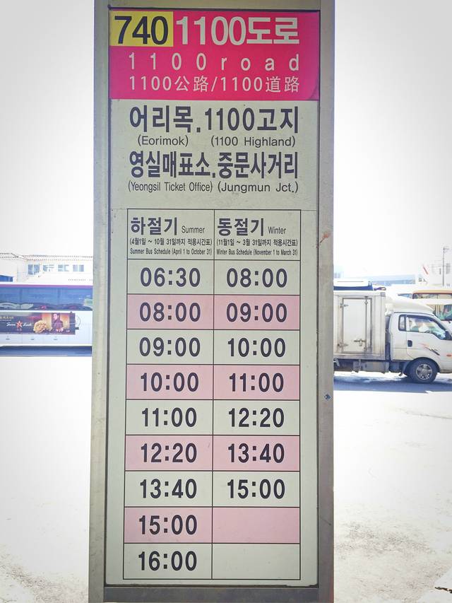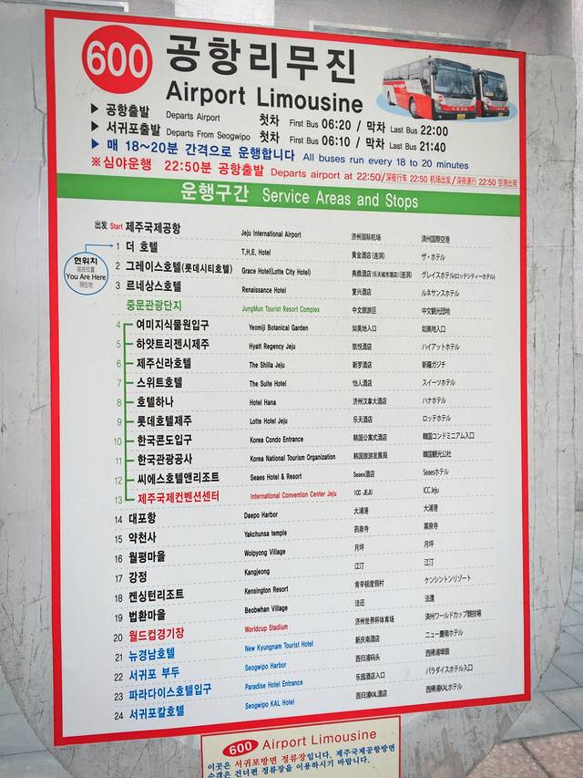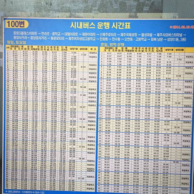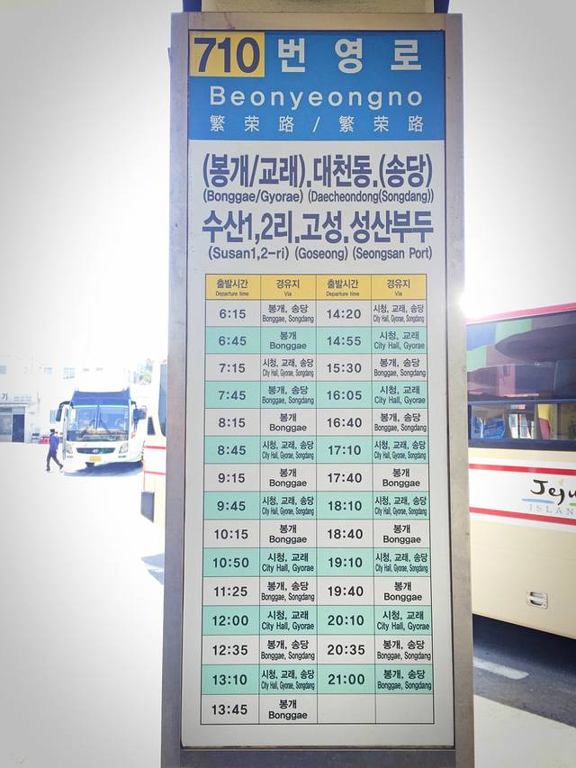 ❤交通❤ 因为“轻敌”,我磨蹭到很晚才出发~出酒店右转,首先找到【100路公交车站】,坐到【济州市外巴士总站】下车~然后在那里转乘【740路】公交车,在【御里木站】下车即可~但是问题来了,之前并没有了解到740路的发车时间,到了那里才发现发车间隔好长,要等近一个小时,当时内心是崩溃的……赠人玫瑰手有余香,拍下了发车时间表,大家规划行程的时候一定要掌握好发车时间哈~