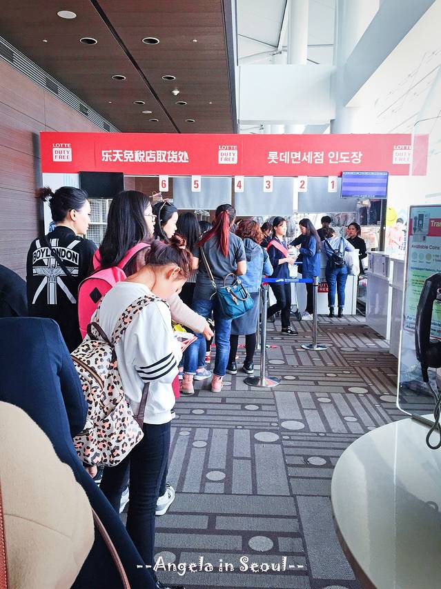 但是,我错了……还好听妈妈的话提早过去,这个环节比预想中耗时得多~首先要找到机场快轨的入口,乘坐它抵达相应的登机口附近~然后要找到取货地点排队取货,据说新罗那里没人,但乐天这里却排了好久~排队的人数不是我们能控制的,我们能做的只能是提早过去,才能不慌不忙从容应对~