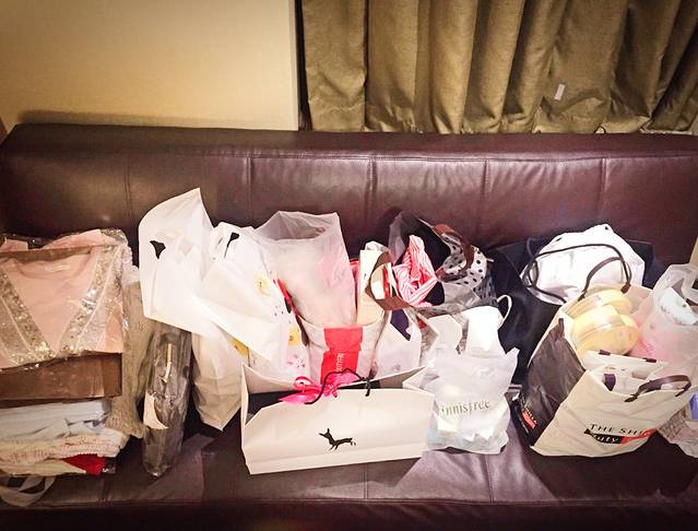 在酒店堆了一沙发完全拿不了只能买个大箱子去装它们的战利品们~