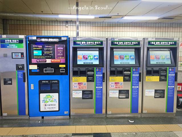 首尔地铁站里的各种机器~最左边的是【押金退款机】,如果你买了普通的地铁卡,出站后把卡放进这个机器,就可以退回500韩币押金~那个蓝色的大家伙就是【T-money卡的充值机器】,右边的三个是【购票机】,T-money丢后我就是用它买的普通地铁卡,然后再用最左边的机器退押金~都有中文界面,按说明操作就好~